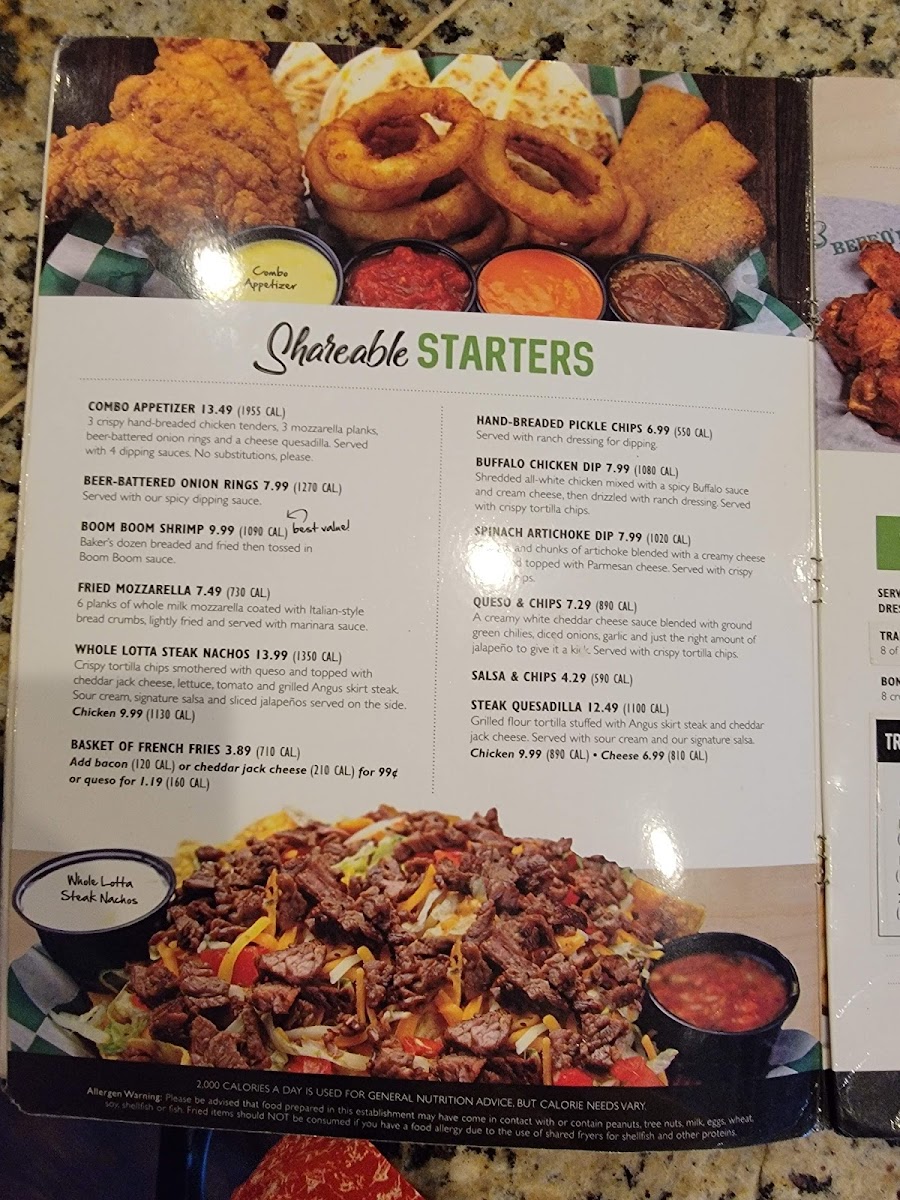 10 breaded and fried then tossed in Boom Boom sauce. (1090 CAL.)
